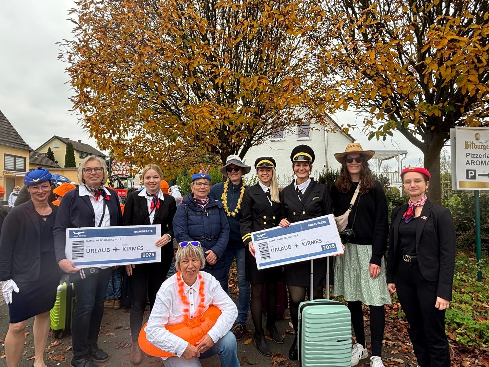 Der Festumzug stand am Sonntag, den 12.10.2025, für die Haselbachschule unter dem Motto "Zurück aus dem Süden". Trotzdessen, dass die Kirmes mitten in die Herbstferien fiel, waren etwa 70 Kinder dabei. Mit Koffern, Schwimmreifen, Sonnenbrillen und bunten Hüten sorgten sie für Aufsehen an diesem grauen Herbsttag. Zum Lied "Ab in den Süden" mit umgedichtetem Text wurde geklatscht, mitgesungen und ein bisschen Sommerstimmung in den Herbst gebracht.